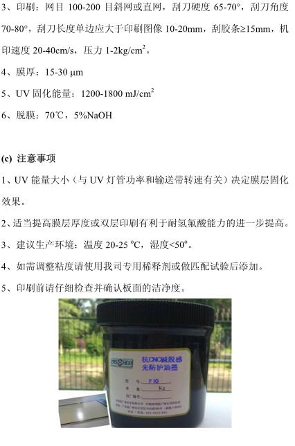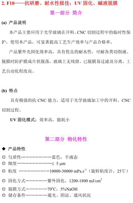 F10——抗研磨、耐水性極佳;UV固化、堿液脫膜