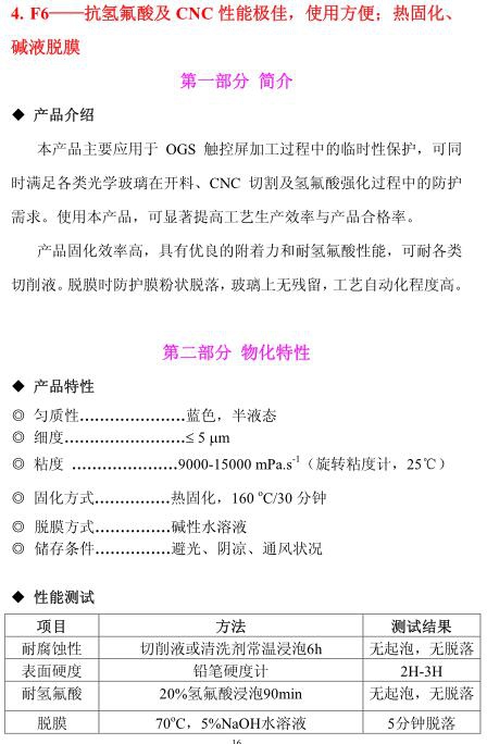 F6——抗氫氟酸及CNC性能極佳,使用方便;熱固化、堿液脫膜
