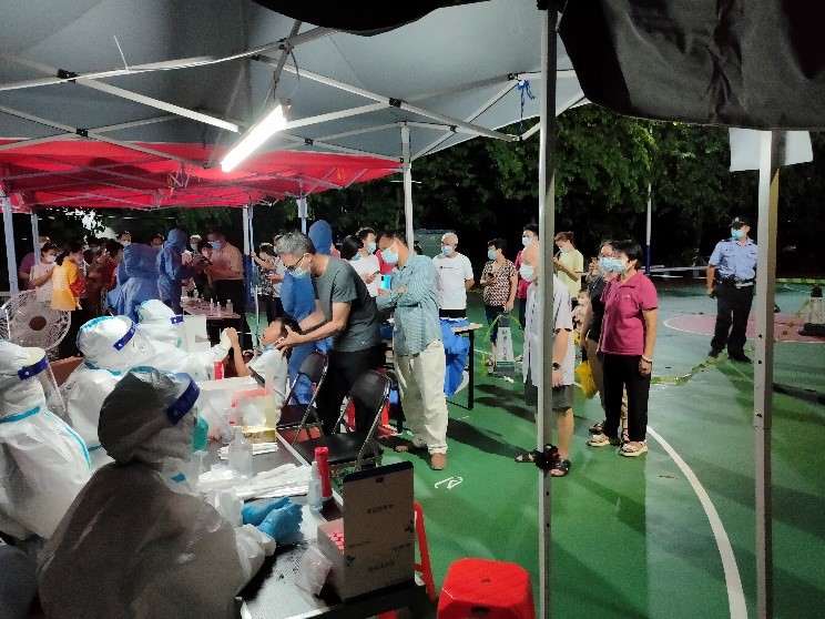 雖然天氣炎熱,身穿厚厚的防護服,我們的信息員及工作人員發揚著我黨一不怕苦、二不怕累的優良傳統,嗓子喊啞了、衣服汗濕了,都不退縮,堅守在崗位上。社區黨員志愿者、園區熱心家屬、社區民警也趕來支援。在大家的共同努力下,于65日下午7時順利完成了園區的核酸檢測采樣任務。