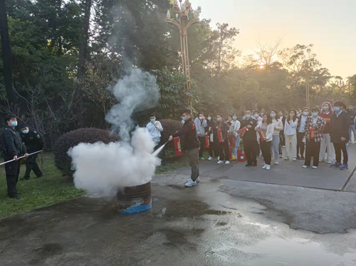 隨后全體參會人員移步實驗樓廣場,保利物業現場演示了實驗樓消防系統滅火,教官對現場展示的防火面罩、滅火器、消防剪、消防帶等器材進行操作說明。