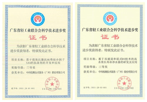 近日,中科院廣州化學(xué)有限公司控股子公司——中科檢測技術(shù)服務(wù)(廣州)股份有限公司(中科檢測)主導(dǎo)的“基于強(qiáng)效抗菌抗病毒組合因子SAA的洗滌劑的開發(fā)和應(yīng)用”及“基于雙通道串聯(lián)式RO技術(shù)的高水效長壽命凈水器的研發(fā)及應(yīng)用”雙雙榮獲廣東省輕工業(yè)聯(lián)合會科學(xué)技術(shù)進(jìn)步獎——三等獎。